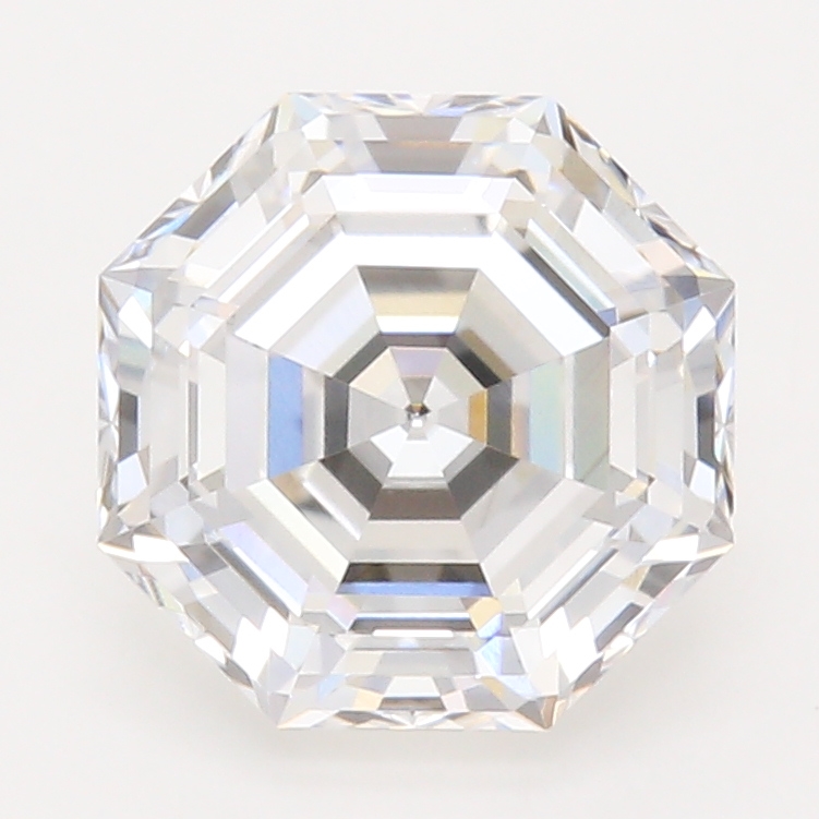 An octagonal blue-green Montana sapphire center stone is held by a platinum bezel in this geometric engagement ring.