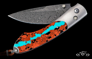 The frame of this knife is lightweight aerospace grade titanium and inlaid with carbon fiber. The blade is 'Wave' damascus steel, with a stainless steel thumb stud and button lock. - William Henry
