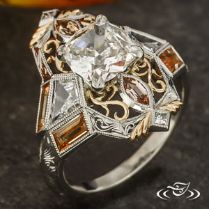 This custom 14k rose gold dragon ring is truly a one-of-a-kind work of art. At the heart of this captivating piece are two shield-shaped stones, one padparadscha colored sapphire and one color change alexandrite, that form the majestic wings of the dragon. The dragon’s tail is adorned with a dazzling pear cut sapphire,