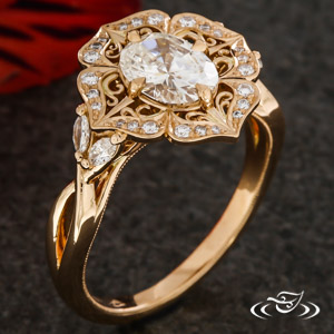 An oval diamond is framed by clusters of round and marquise diamonds in this beautiful rose gold engagement ring.