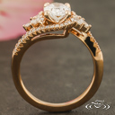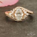 On oval diamond is framed by fans of marquise diamonds and wrapping strands of french set diamond pave.