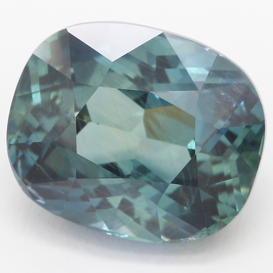 A cushion-cut parti sapphire radiates with deep, captivating hues, is framed by two sparkling trillion-cut diamonds and a halo of 32 meticulously set round diamonds.
