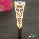 Custom 18k rose gold split shank engagement ring with intricate hand fabricated fine wire filigree curls wrap set with round fancy green and teal diamonds and round blue sapphires.