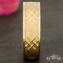 Custom 18k rose gold band with a raised geometric design encircling the band. The raised areas of the design and the rails have a high polish finish, and the background has a matte finish.