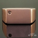 Custom 14kt rose gold signet ring with rectangular top plate. Piece has flush set round champagne diamond accent gem in corner of top plate. High polish, with matte finish on top plate, round shank.