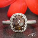Palladium rustic halo design with (18) 1.3mm french set diamonds totaling 0.18ctw. Center set with 1.69ct rustic Reddish brown rose cut diamond. Size 6.5