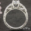 A round diamond is framed by diamond filled leaves in this vintage style engagement ring.