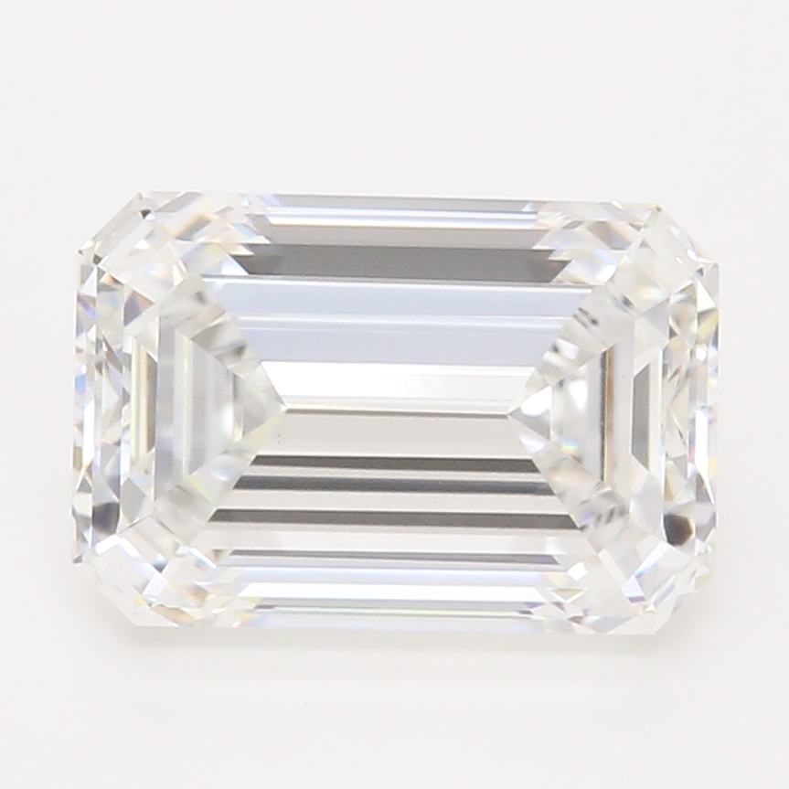 Custom 950 platinum ring holding (1) emerald cut diamond center stone with (8) GLJW provided round cut diamond melee bead set in the hidden partial-halo framing the north and south side faces of the setting.