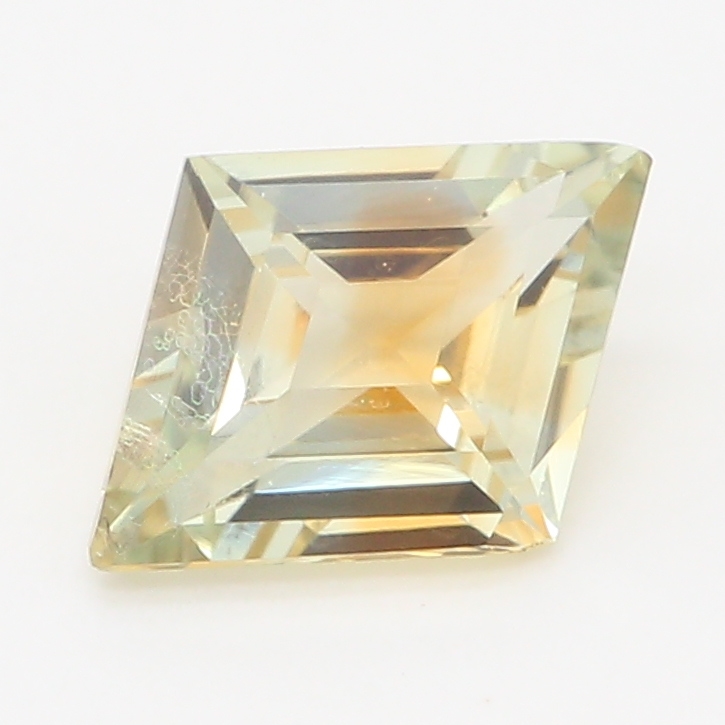 Two delicately engraved fiddlehead ferns frame an angular rose cut kite shaped diamond in this two-tone wedding ring.
